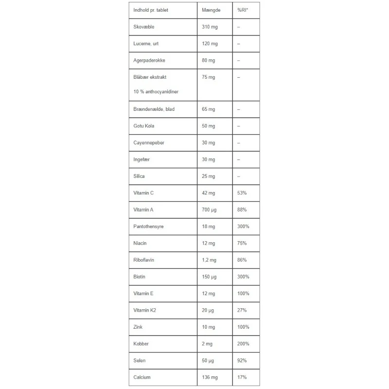 Calciumcarbonat, Skovæble (Malus domestica Borkh.), Vegetabilske kapsler: hydroxypropyl methyl cellulose, Lucerne urt (Medicago sativa L.), Agerpadderokke urt (Equisetum arvense L.), Blåbær ekstrakt med 10 % anthocyanidiner ((Vaccinium myrtillus L.), Brændenælde blad (Urtica dioica L.), Asiatisk centelle blad (Centella asiatica (L.) Urb), Calcium-L-ascorbat, DL-alpha-Tocopherylacetat, Cayennepeber frugt (Capsicum annuum L), Ingefær rod (Zingiber officinale L.), Antiklumpningsmiddel: Silica, Calcium-D-pantothenat, Kobbergluconat, Zinkoxid, Nicotinamid, Menachinon-7 (soja), Retinylacetat, Riboflavin, D-biotin, Natriumselenit