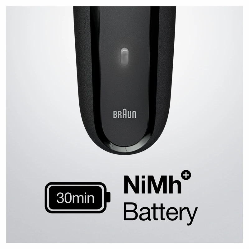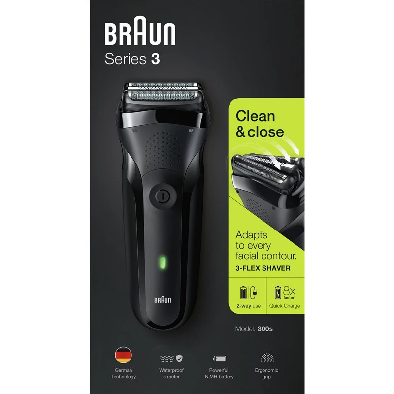 Braun Series 3 300s Shaver er udviklet med et kraftfuldt, genopladeligt Ni-Mh batteri, som giver op til 30 minutters anvendelse på en fuld opladning, mens 5 minutters hurtigopladning rækker til en enkelt barbering. Derudover kan barbermaskinen også anvendes med ledningen tilsluttet. Denne shaver er ligeledes 100 % vandtæt, så den er nem at rense under rindende vand.