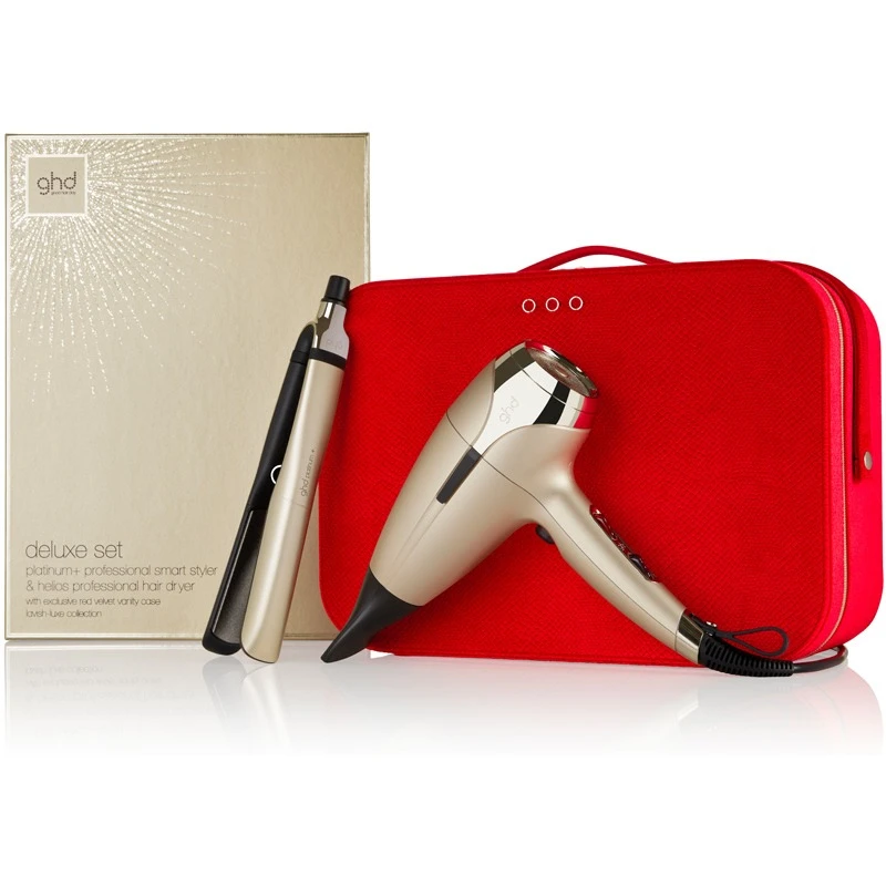 ghd Platinum+ & Helios Set Grand-Luxe Collection Deluxe Set er den ultimative luksusæske til kvinden, som fortjener eksklusiv forkælelse, og hvor kun det bedste er godt nok. Denne æske indeholder både det fantastiske ghd platinum+ glattejern og den effektive ghd Helios føntørrer, begge i en limited udgave i en smuk, gylden, champagnefarve.