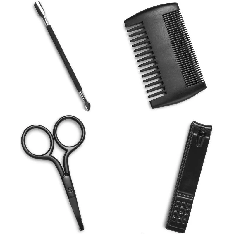 Ikke nok med at man får en utrolig smart og praktisk toilettaske, så indeholder den også nogle produkter, som er helt uundværlige i toilettasken. Den indeholder nemlig en neglesaks, negleklipper, neglebåndsskubber, samt en dobbeltsiddet skægkam.
