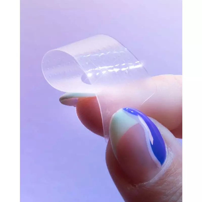 - Træk strimlen af den lange strip og anbring den klæbende side på forsiden af tænderne i overmunden