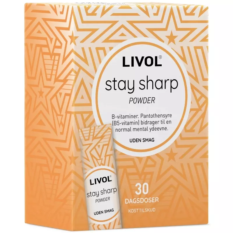 Livol Stay Sharp Powder Stick er et kosttilskud til voksne. Med Livol Stay Sharp kan du tage dit daglige tilskud af B-vitaminer, præcis som du har lyst til. Tilskuddet kommer nemlig som smagsneutralt pulver i praktiske doseringsbreve, så du let kan blande det i fx et glas vand eller drysse det over din morgenmad.