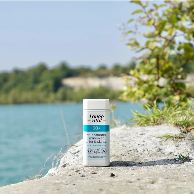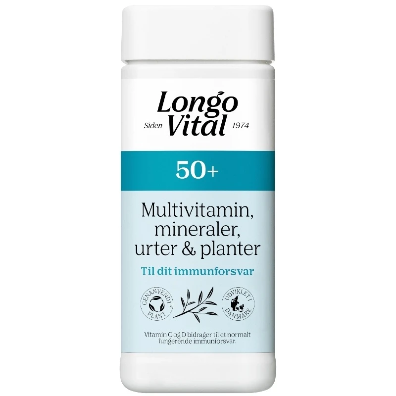 LongoVital 50+ er specielt udviklet til dig, der er fyldt 50 år, og er et kosttilskud med urter, vitaminer og mineraler. LongoVital 50+ indeholder A-, B6-, B12-, C- og D-vitamin samt Folsyre og Zink, som bidrager til et normalt fungerende immunforsvar. Derudover bidrager Kalk og Magnesium sammen med vitamin D til vedligeholdelse af normale knogler og normal muskelfunktion, mens vitamin A, Riboflavin og Zink bidrager til at vedligeholde et normalt syn.
