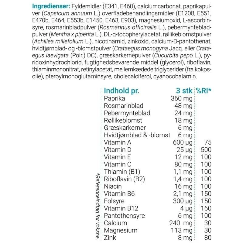 Fyldemidler (E341, E460), calciumcarbonat, paprikapulver (Capsicum annuum L.) overfladebehandlingsmidler (E1208, E551, E470b, E464, E553b, E1450, E463, E903), magnesiumoxid, L-ascorbinsyre, rosmarinbladpulver (Rosmarinus officinalis L.), pebermyntebladpulver (Mentha x piperita L.), Dl-alfa-tocopherylacetat, røllikeblomstpulver (Achillea millefolium L.), nicotinamid, zinkoxid, calcium-D-pantothenat, hvidtjørnblad- og blomsterrpulver (Crataegus monogyna Jacq. eller Crataequs laevigata (Poir.) DC), græskarkernepulver (Cucurbita pepo L.), pyridoxinhydro-chlorid, fugtighedsbevarende middel (glycerol), riboflavin, thiaminmononitrat, retinylacetat, mellemkædede triglycerider (fra kokosolie), pteroylmonoglutaminsyre, cholecalciferol, cyanocobalmin.