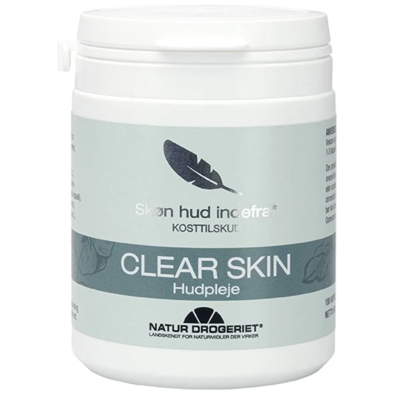 Natur Drogeriet Clear Skin er et vegansk kosttilskud til voksne og børn fra 11 år. Clear Skin kapsler indeholder fire droger: Stedmoderblomst, burrerod, sarsaparillerod og blomsterkarse – en smagskombination, der kan være svær at holde af. Derfor fås de fire droger i praktiske kapsler med 270 mg urteblanding pr. kapsel. Stedmoderblomst hjælper i tilfælde af tør hud og medvirker til at vedligeholde hudens generelle natur og udseende samt til at vedligeholde en normal hud indefra.