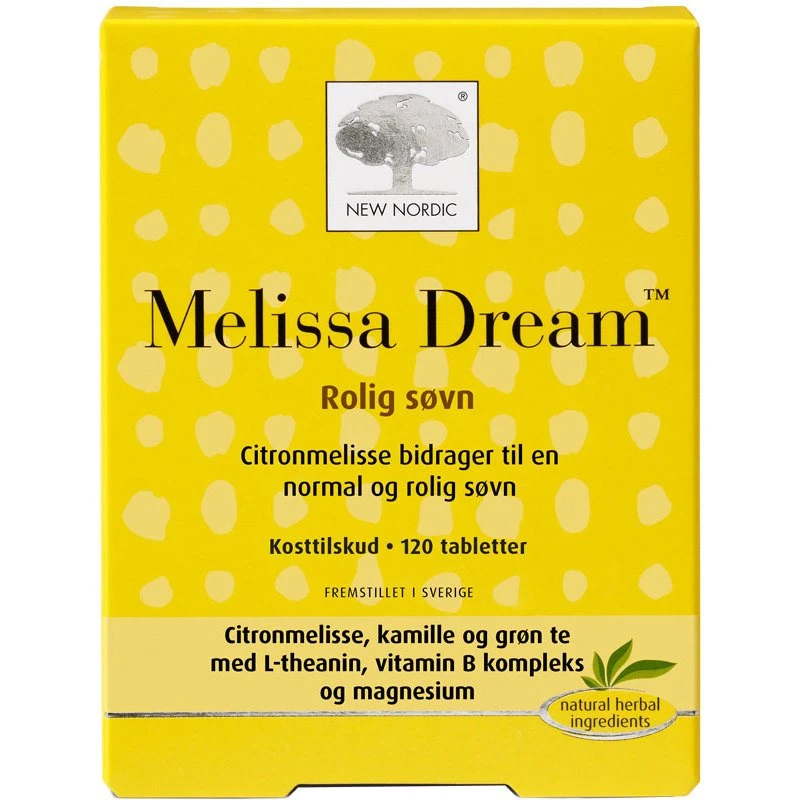 New Nordic Melissa Dream er et kosttilskud til voksne. En god og rolig søvn har afgørende betydning for kroppens genopbygning, og følelsen af at vågne op, frisk og udhvilet. Melissa Dream™ tabletten er baseret på et kombinationsekstrakt af citronmelisse, kamille og grøn te, plus B-vitaminer og magnesium. Citronmelisse bidrager til en optimal afslapning og hjælper med at opretholde en normal og sund søvn. B-vitaminerne i produktet bidrager sammen med indholdet af magnesium til normal funktion af nervesystemet. B-vitaminerne: thiamin, niacin og B6 samt magnesium bidrager desuden til normal psykologisk funktion.