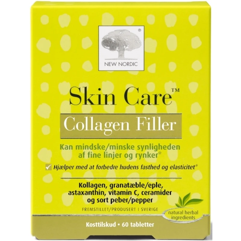 New Nordic Skin Care Collagen Filler 60 Pieces er skønhed indefra, i form af kosttilskud. Skin Care™ Collagen Filler tabletten mindsker synligheden af fine linjer og rynker. Tabletten hjælper også med at forbedre hudens fasthed og elasticitet.