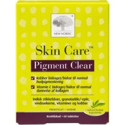 New Nordic Skin Care Pigment Clear 60 Pieces er baseret på indiske stikkelsbær, samt standardiseret ekstrakt af granatæble og naturlig astaxanthin. Tabletten indeholder kobber, som bidrager til normal hudpigmentering. Tabletten indeholder desuden vitamin C, der bidrager til normal dannelse af kollagen, som har betydning for normalt fungerende hud. Tabletten er et godt supplement til den daglige skønhedspleje.