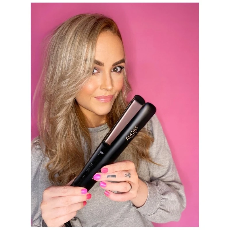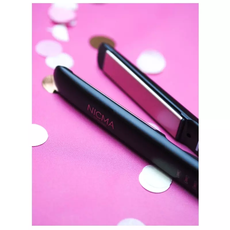 NICMA Styling – The Hair Straightener er et glattejern i høj kvalitet, der gør det muligt at skabe en masse forskellige styles. Den er lavet i et sort design med rose gold detaljer, som giver et glamourøst og stilet look. Temperaturen på jernet kan justeres fra 160-230 grader, så man kan indstille det lige præcis efter egne behov, alt efter om man har et fint eller kraftigt hår. De keramiske plader har en ultra-glat overflade, som gør at de glider ubesværet igennem håret. Derudover kan de vippes fra side til side, hvilket gør, at man udover at kunne glatte sit hår, også både kan lave bølger og krøller med dette jern.
