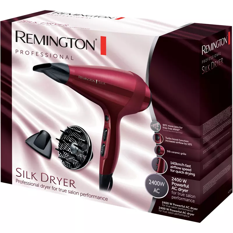 Remington Silk Dryer er en professionel føntørrer, som skaber salonlignende resultater. Den er udviklet med en 2400W AC motor af høj kvalitet og med lang levetid, som leverer kraftige luftstrømme på op til 140 km/t, for at sikre dig hurtig og effektiv tørring.