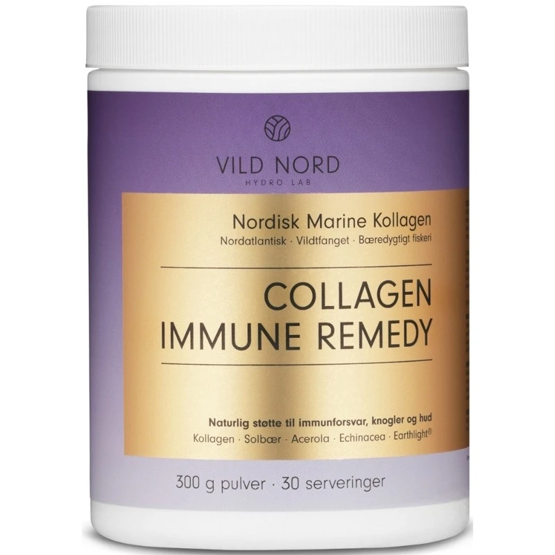 Vild Nord Collagen Immune Remedy er en unik kollagenblanding med et højt indhold af vitamin C og D samt protein, som kan give daglig støtte til dit immunforsvar, dine knogler og din hud. Collagen Immune Remedy er en let og lækker løsning til dig, som har behov for et enkelt produkt, hvor velvære og skønhed går hånd i hånd. Blandingen opløses let og har en smuk bordeaux farve og en lækker, naturlig smag af solbær, som gør produktet let at anvende hver dag. Collagen Immune Remedy er danskproduceret og blandet af hydrolyseret marine kollagen fra bæredygtigt fiskeri, spray-dried solbær og acerola, samt pulver fra blomsten Purpur Solhat (Echinacea) og Earthlight®, som er et pulver udvundet af økologiske champignon.
