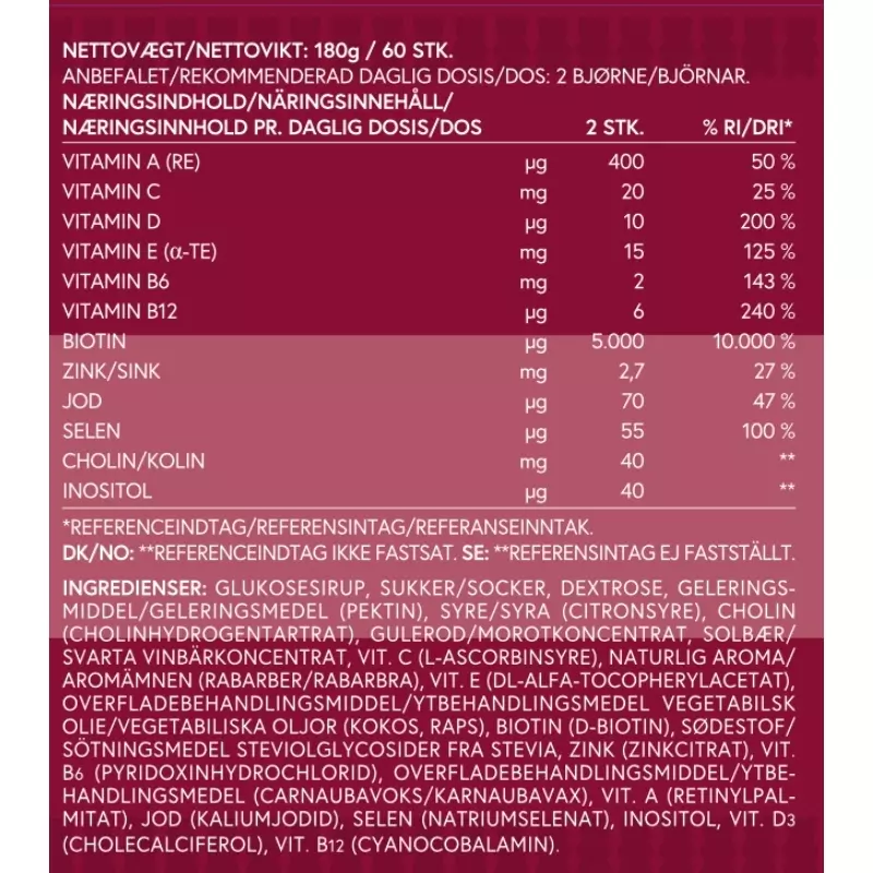 Kosttilskuddet har til formål at supportere hår og negle. Vingummierne indeholder Biotin som hjælper til at vedligeholde et normalt hår, samt bl.a. Vitamin D og B12 som spiller en rolle i celledelingsprocessen.